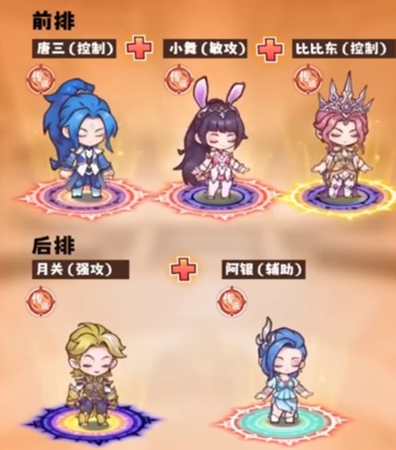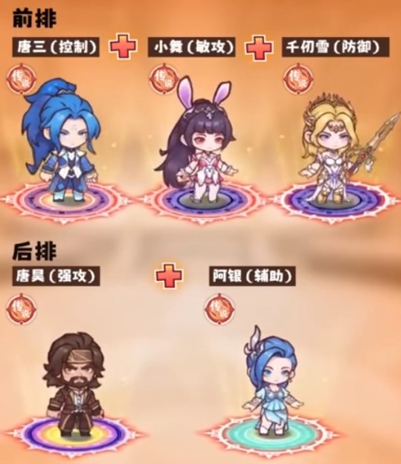 这套阵容以控制与爆发为核心,前排由千仞雪担任主坦,具备较强的防御能力,能够有效吸收伤害并为后排创造输出空间。唐三作为核心控制角色,可在战斗中施加关键debuff,限制敌方行动节奏。小舞在中排提供辅助进攻,配合其灵活的位移机制打出额外伤害。后排唐昊是主要物理输出点,拥有高额爆发技能,能在短时间内击溃对手防线。阿银则作为团队中的特殊辅助存在,不仅能提供治疗和增益效果,还可在危急时刻献祭自身,复活一名已阵亡的队友,极大提升队伍容错率。