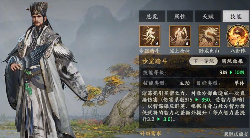 当诸葛亮等级达到5级后,玩家可开启其天赋系统,优先加点谋略属性能显著提升技能伤害。在升至15级时,将激活标志性被动“空城计”,该技能可在特定条件下降低敌方命中率或反制突击单位,极大增强了对抗骑兵阵容时的应对能力。搭配黄月英作为副将,还能进一步提升全队的谋略输出效率,形成高效的智战组合。