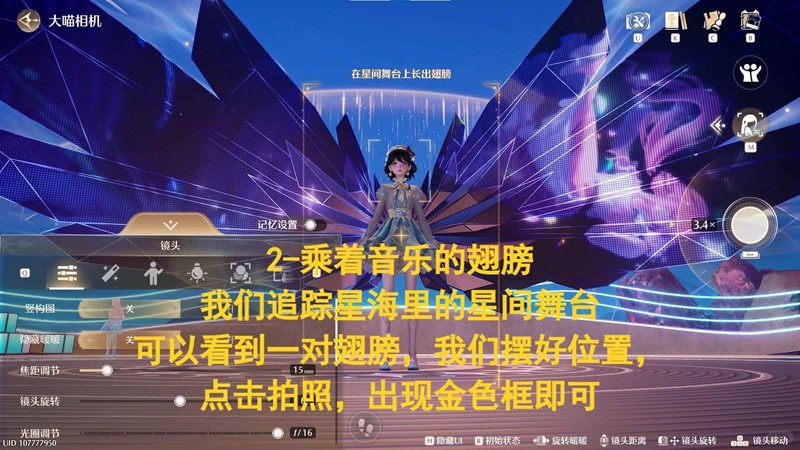 在星海的星间舞台上有一对大翅膀,我们站在翅膀中间位置,对准后,打开相机,出现金色框框即可;