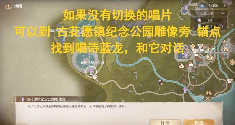如果没有可切换的唱片,可以传送到 古花愿镇纪念公园雕像旁 锚点,找到唱诗蓝龙,点击对话,可以用露珠兑换唱片;