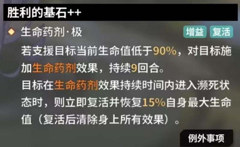 热尼亚的核心技能“胜利的基石”赋予她独特的生命药剂效果。当友军角色生命值低于50%时,该技能会自动触发,为目标施加持续3回合的生命药剂状态。在此期间若目标陷入濒死,热尼亚将立即将其复活,并恢复其10%的最大生命值。值得注意的是,复活时目标身上所有增益或减益效果均会被清除,确保其以干净状态重返战场。这一机制使得热尼亚在应对突发团灭情况时具备极强的控场与救援能力,是队伍中稳定战线的重要保障。