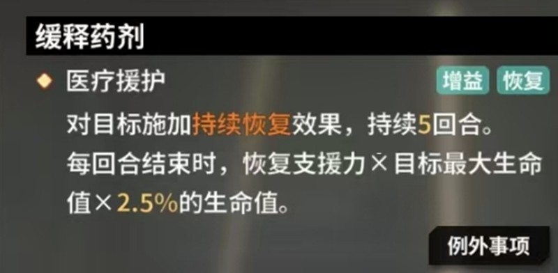 热尼亚的另一个常驻技能“缓释药剂”提供稳定的持续治疗支持。施放后可为目标施加持续5回合的回复效果,每回合结束时恢复目标最大生命值1%的血量。虽然单次恢复量不高,但胜在稳定且无需额外操作。该技能在实战中可有效缓解持续掉血的压力,尤其适用于对抗带有中毒、灼烧等持续伤害机制的敌人,帮助队伍维持健康血线。