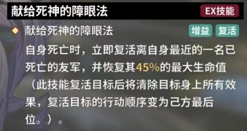 觉醒技能“倒计时的停止”专注于驱散持续伤害类负面效果,能够瞬间清除队友身上的中毒、流血等状态,防止其在战斗中被持续消耗。而她的终极技能“献给死神的障眼法”则在自身死亡时触发,立即复活一名最近阵亡的友军,并恢复其45%的最大生命值。复活后目标行动顺序调整为己方最后一位,且清除所有状态,为队伍争取宝贵的反击机会。这一技能在逆风局中往往能实现翻盘,是热尼亚作为团队基石的终极体现。
