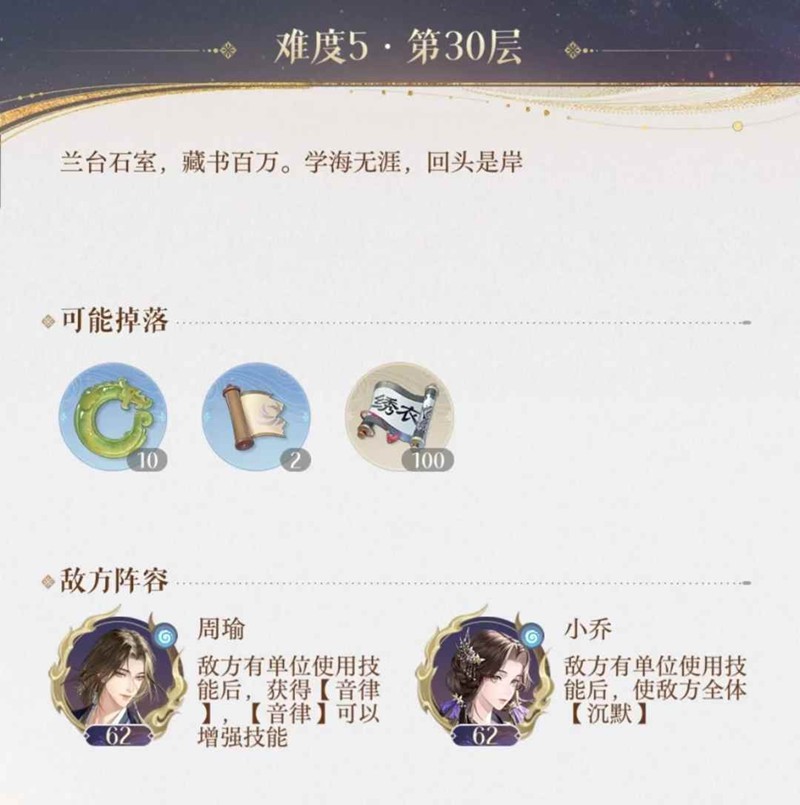 如鸢游戏中,玩家是女扮男装的“广陵王”,作为密探组织“绣衣楼”的首领,在推进主线剧情的过程中与文曲尉、太仆、孙氏少主等主角产生不同的情感羁绊。那么游戏中兰台二期难度5-30层怎么打呢?小编为你准备了一份攻略,一起来看看吧~