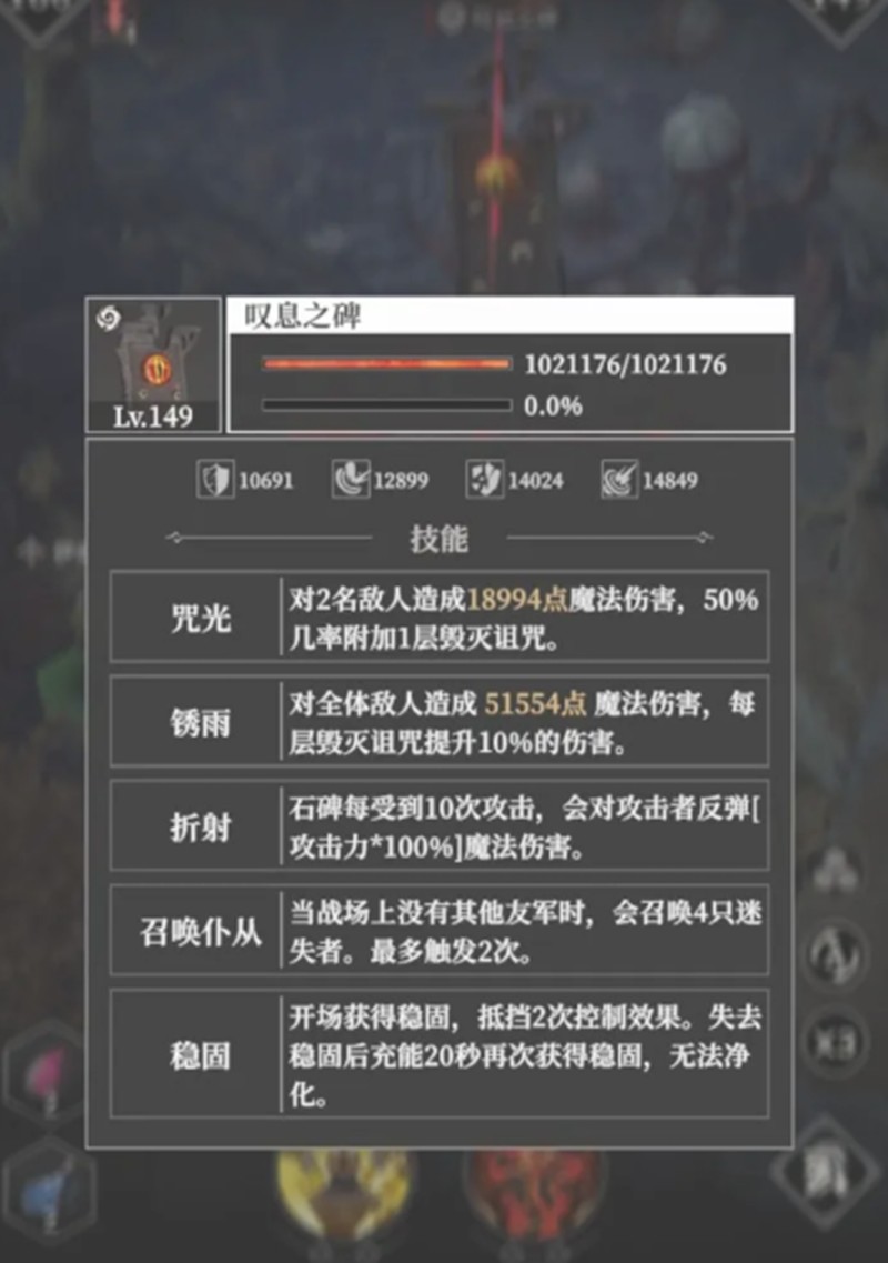 地下城堡4叹息之碑是游戏中极具挑战性的关卡之一,许多玩家在初次面对时都感到棘手。这块矗立在墓穴深处的古老石碑不仅是地图的核心标志,更是本关的最终BOSS。进入该区域后,原本静谧的墓道会随着玩家靠近而发生变化,石碑表面裂开猩红竖瞳,触须从地面钻出,战斗随即爆发。了解地下城堡4叹息之碑的机制和通关技巧,对推进剧情和提升战力至关重要。