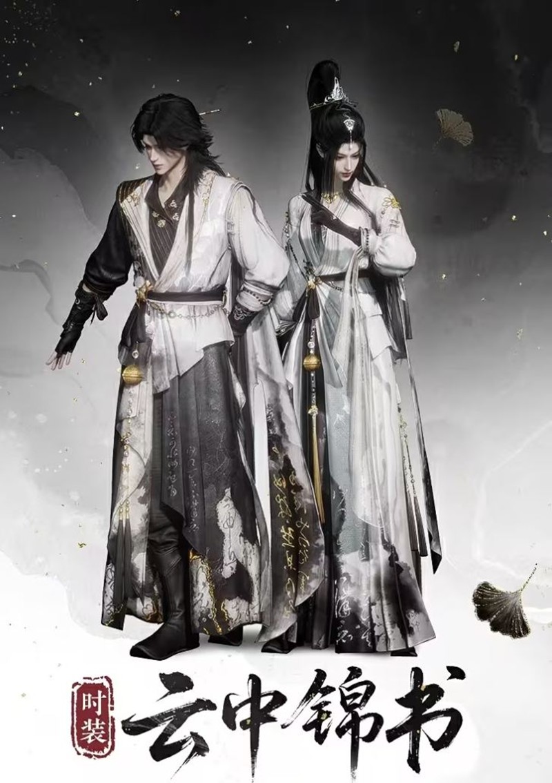 “云中锦书”的设计灵感来源于古代文人的高洁与从容。世间侠客多佩刀剑,而这位侠士却以笔墨为刃,展现出一种锋芒内敛的侠骨。素白底似宣纸铺陈,任由清风执笔,在衣间写就诗文行书,晕染远山淡云,展现出一种超然物外的意境。