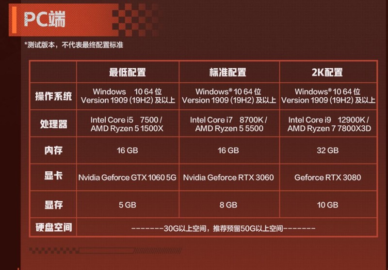 2K配置操作系统:Windows 10 64位Version 1909(19H2)及以上处理器:Intel Core i9 12900K/AMD Ryzen 7 7800X3D内存:32 GB显卡:Geforce RTX 3080显存:10 GB