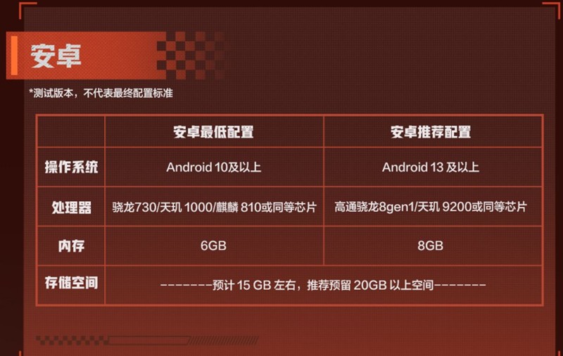 最低配置操作系统:Android 10及以上处理器:骁龙730/天玑1000/麒麟810或同等芯片内存:6GB存储空间:预计15 GB左右,推荐预留20GB以上空间