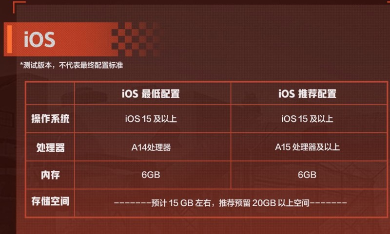最低配置操作系统:iOS 15及以上处理器:A14处理器内存:6GB存储空间:预计15 GB左右,推荐预留20GB以上空间