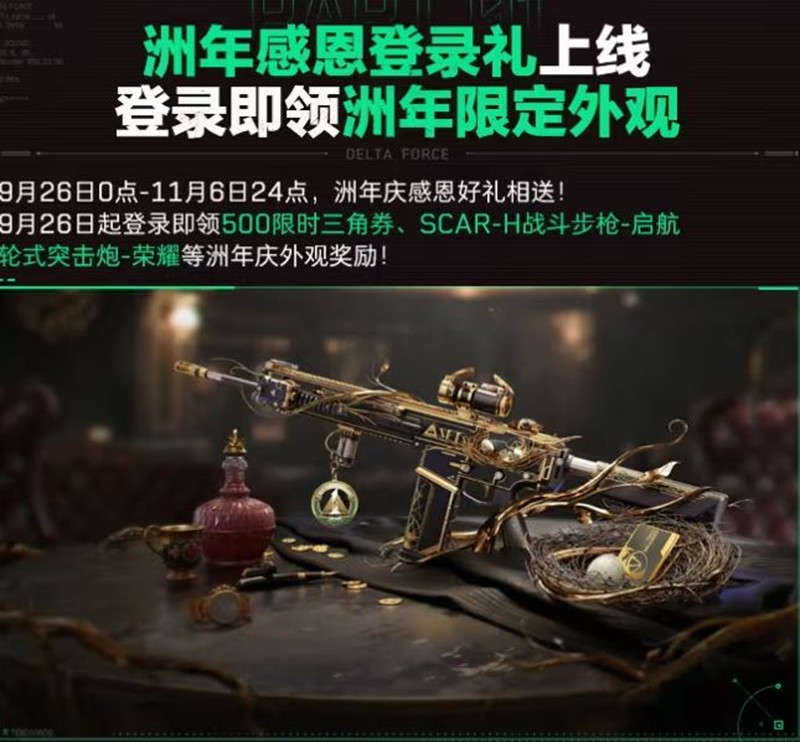 玩家在9月26日至11月6日期间登录游戏,即可领取洲年限定外观奖励。