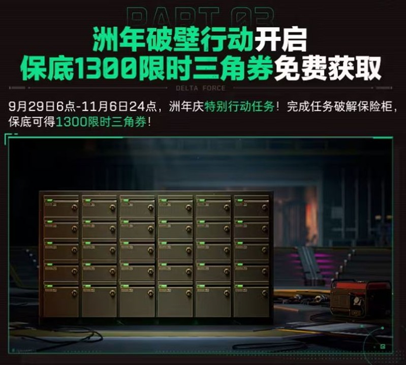 9月29日至11月6日,完成洲年庆特别行动任务,破解保险柜,保底可得1300限时三角券。