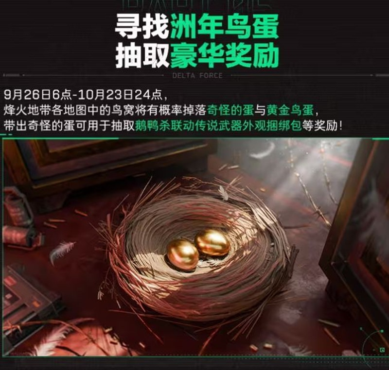 9月26日至10月23日,在烽火地带各地图中的鸟窝将有概率掉落奇怪的蛋与黄金鸟蛋。