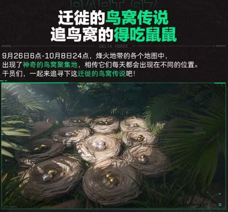 9月26日至10月8日,烽火地带的各个地图中,出现了神奇的鸟窝聚集地。