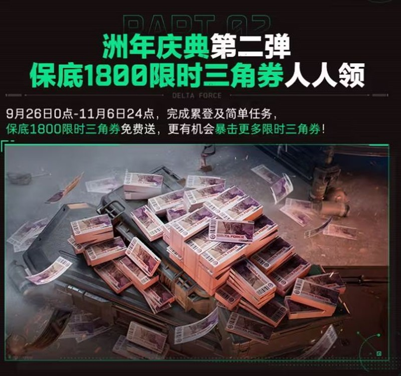 9月26日至11月6日,完成累计及简单任务,保底1800限时三角券免费送。
