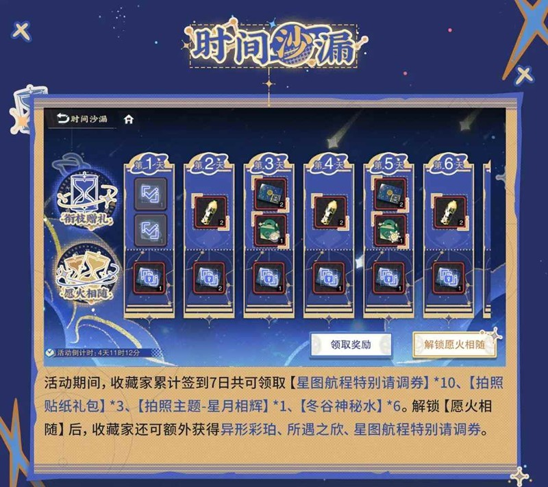 活动期间,收藏家累计签到7日共可领取【星图航程特别请调券】*10、【拍照贴纸礼包】*3、【拍照主题-星月相辉】*1、【冬谷神秘水】*6。解锁【愿火相随】后,收藏家还可额外获得异形彩珀、所遇之欣、星图航程特别请调券。