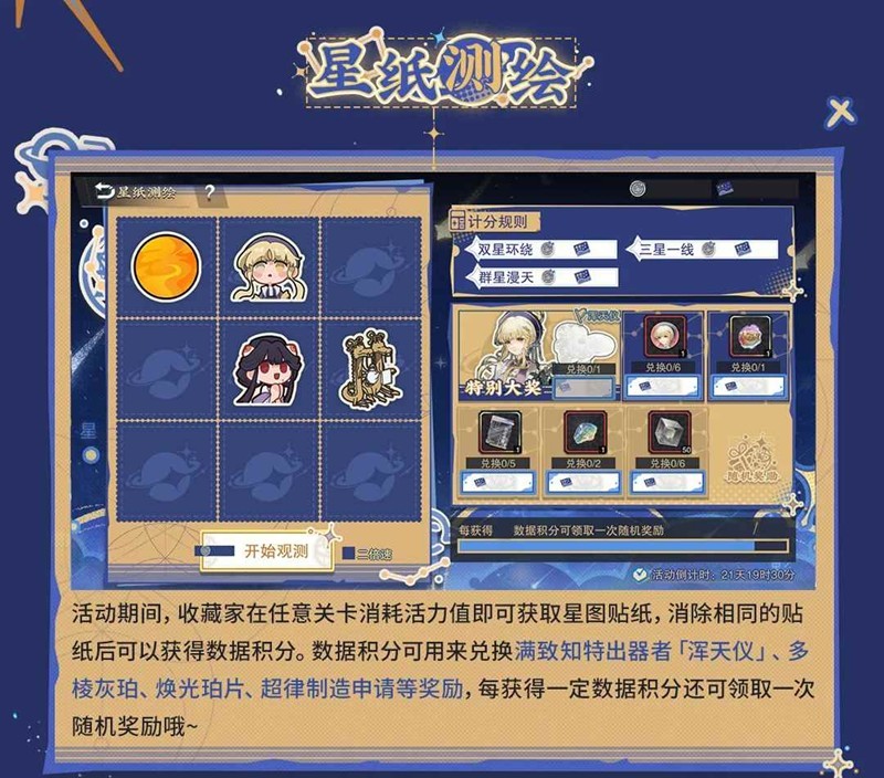 活动期间,收藏家在任意关卡消耗活力值即可获取星图贴纸,消除相同的贴纸后可以获得数据积分。数据积分可用来兑换满致知特出器者「浑天仪」、多棱灰珀、焕光珀片、超律制造申请等奖励,每获得一定数据积分还可领取一次随机奖励哦~