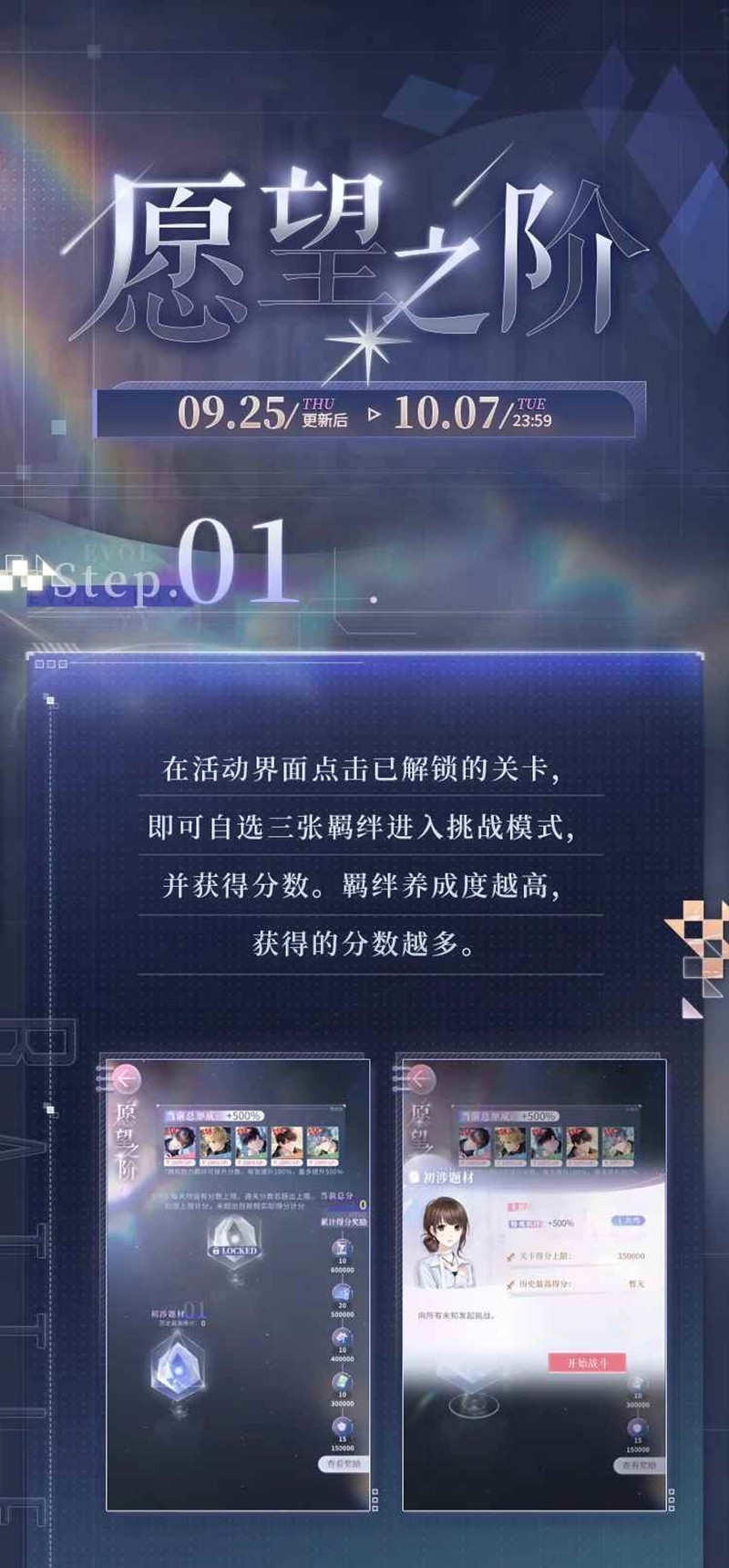 恋与制作人第三季愿望之阶:全新羁绊挑战副本现已开启~活动期间,可从主界面或【精彩活动】-【愿望之阶】进入活动界面。活动期间,全部关卡累计获得分数达指定档位,可免费领取限定手账摆件【爱之所以为爱】等奖励,一起来和小编看看吧~