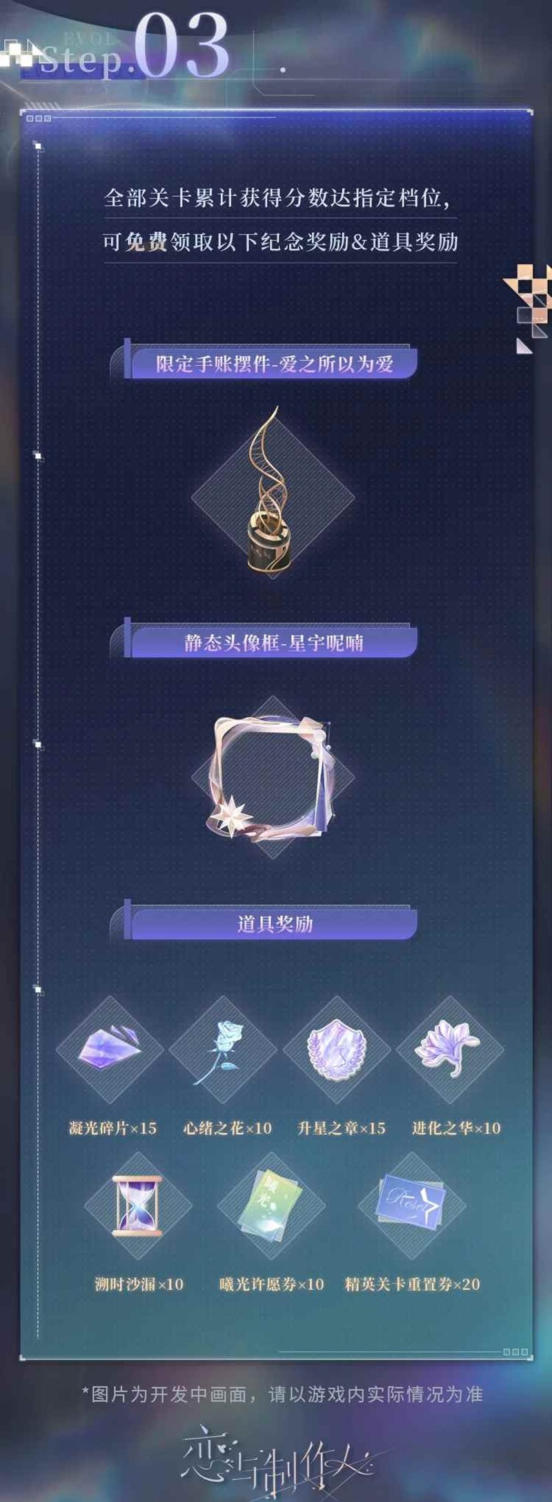 活动期间,全部关卡累计获得分数达指定档位,可免费领取限定手账摆件【爱之所以为爱】、静态头像框【星宇呢喃】,以及【凝光碎片*15、心绪之花*10、升星之章*15、进化之华*10、溯时沙漏*10、曦光许愿券*10、精英关卡重置券*20】道具奖励。