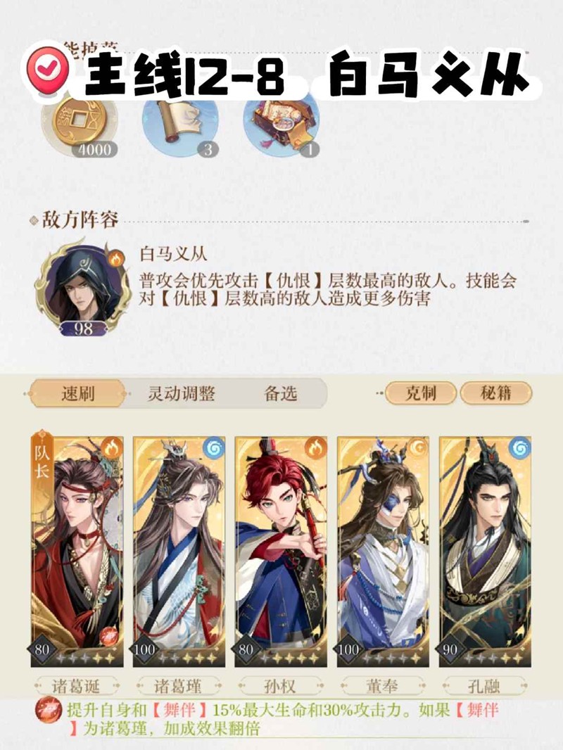 如鸢游戏以策略卡牌和沉浸式剧情为核心玩法,如鸢主线剧情中经常有高难度关卡玩家一时间难以通关,12-8白马义从这一关就是高难关,那么这一关应该怎么打过呢?小编为你准备了一份攻略,一起来看看吧~