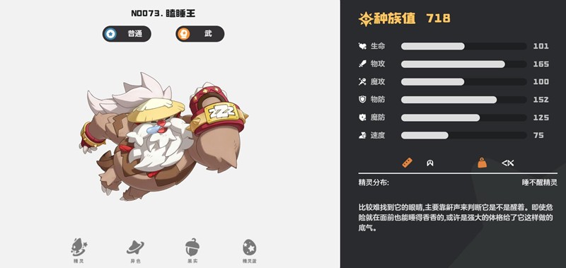 瞌睡王在洛克王国世界武精灵中堪称顶尖存在,种族值高达718,物攻达到165,物防也有152,攻防双优。需要从白发懒人进化而来,30级即可完成进化,在普拉塔草原可以捕捉到初始形态。其特性为慢热型,战斗初期无法释放强力技能,需依赖队友承伤积累能量,建议搭配清场速度快的精灵协助启动。技能方面必带催眠尾巴与垂死反击,后者在血量较低时能打出极高伤害,逆转战局。