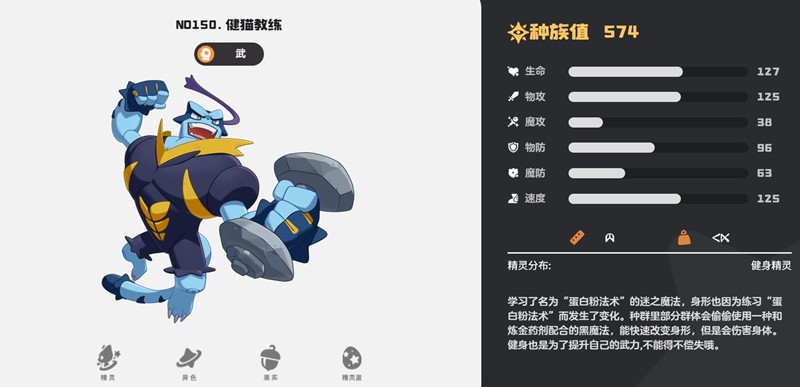 健猫教练是典型的速攻型洛克王国世界武精灵,速度种族值为125,具备先手优势。特性间歇式训练使其在释放武技后物攻永久提升20%,但速度会下降10点。20级即可进化,可在武斗场外围捕捉,适合前期首发使用。由于武系被飞行系克制,且前期飞行系精灵较多,因此在早期对战中输出受限,建议在等级达到四十级左右再重点培养,发挥其持续增伤优势。