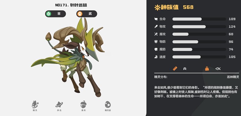 针叶巡林为草武双属性精灵,速度种族值105,特性野性感官可在成功应对对手技能后使下回合先手权+1。该精灵可在迷雾森林捕捉,技能推荐藤鞭与爆裂拳组合,藤鞭对水系精灵有克制效果,适合打消耗战。虽然被火系克制,但凭借先手机制和双系优势,可作为副C位培养,在特定阵容中发挥出色表现。