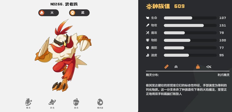 武者鸡拥有151的物攻种族值,爆发能力强,特性斗技使得每次成功应对后技能威力永久提升。由小鸡仔在25级使用力量之羽进化而成。实战中建议先释放愤怒意志提升暴击率,随后配合飞踢打出高额伤害。但由于技能PP值较少,需准备足够的药水支持续航,适合在中短局对战中快速终结对手。