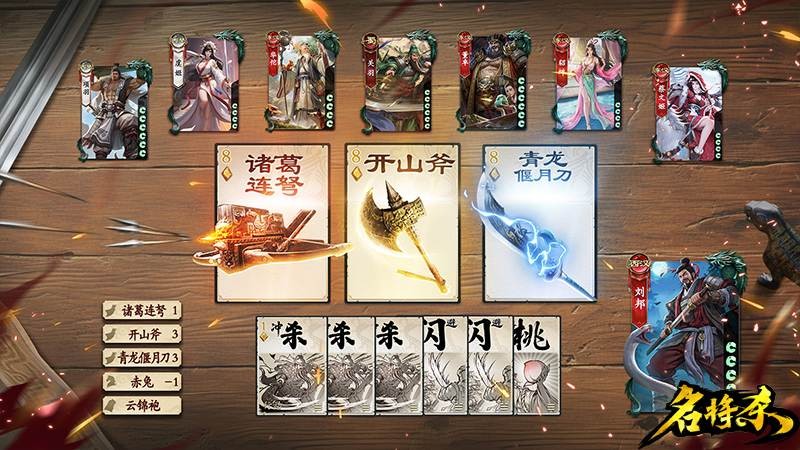 名将杀还推出了“多装备自由搭配”系统,每名武将可同时装备3张任意类型装备牌,通过效果叠加塑造个性战法。游戏注重融合历史典故与武将特质,精心设计技能机制,如诸葛亮的“锦囊妙计”技能,可在每次出牌阶段选择1张专属的战法牌添加到手牌。此外,游戏创新将“金木水火土”五行与卡牌花色对应,数字1~8则融合“八卦”意象。