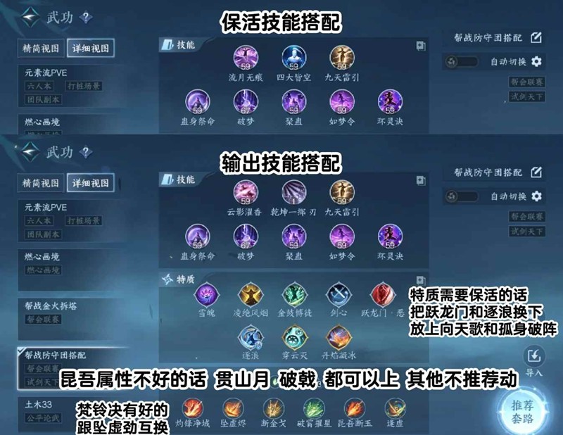 假如需要保活,把跃龙门和逐浪 替换为 孤身破阵和向天歌即可,不推荐防守团,在上更多的防御特质,单防足够了