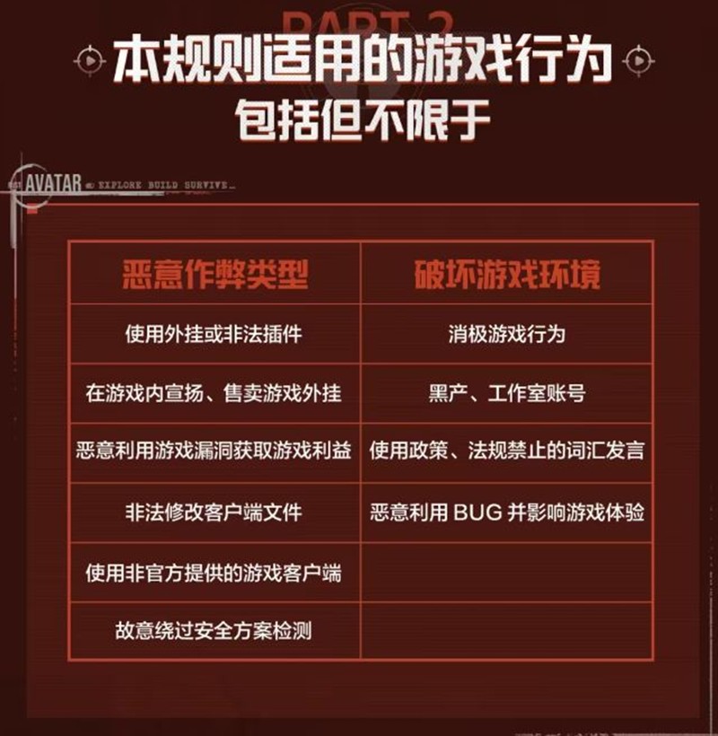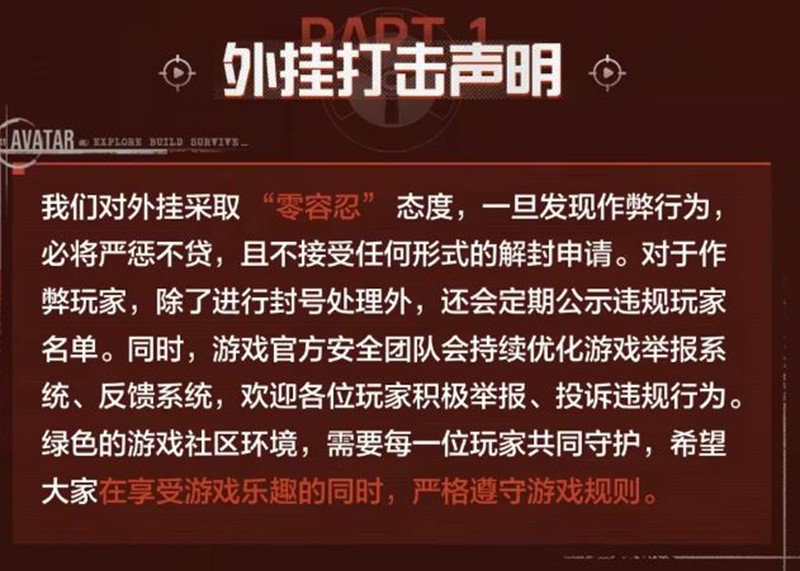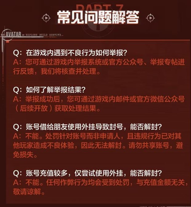 《失控进化》安全团队一直致力于打造公平、绿色健康的游戏社区环境。为了维护良好的游戏秩序,保障广大玩家的游戏体验,官方将对游戏中各类违规行为进行严格惩处。公约中明确指出,对于外挂行为,官方采取“零容忍”态度,一旦发现作弊行为,必将严惩不贷,且不接受任何形式的解封申请。对于作弊玩家,除了进行封号处理外,还会定期公示违规玩家名单。同时,游戏官方安全团队会持续优化游戏举报系统、反馈系统,欢迎各位玩家积极举报、投诉违规行为。