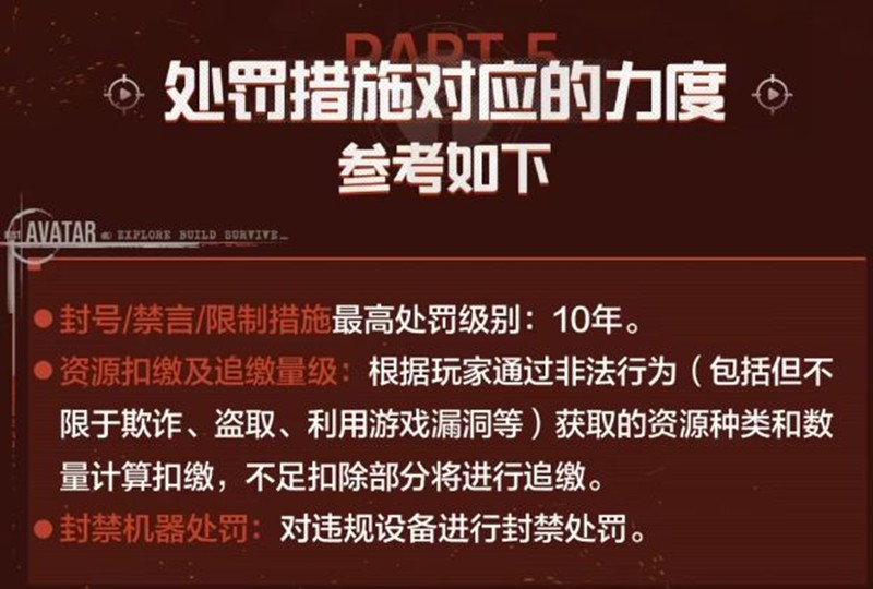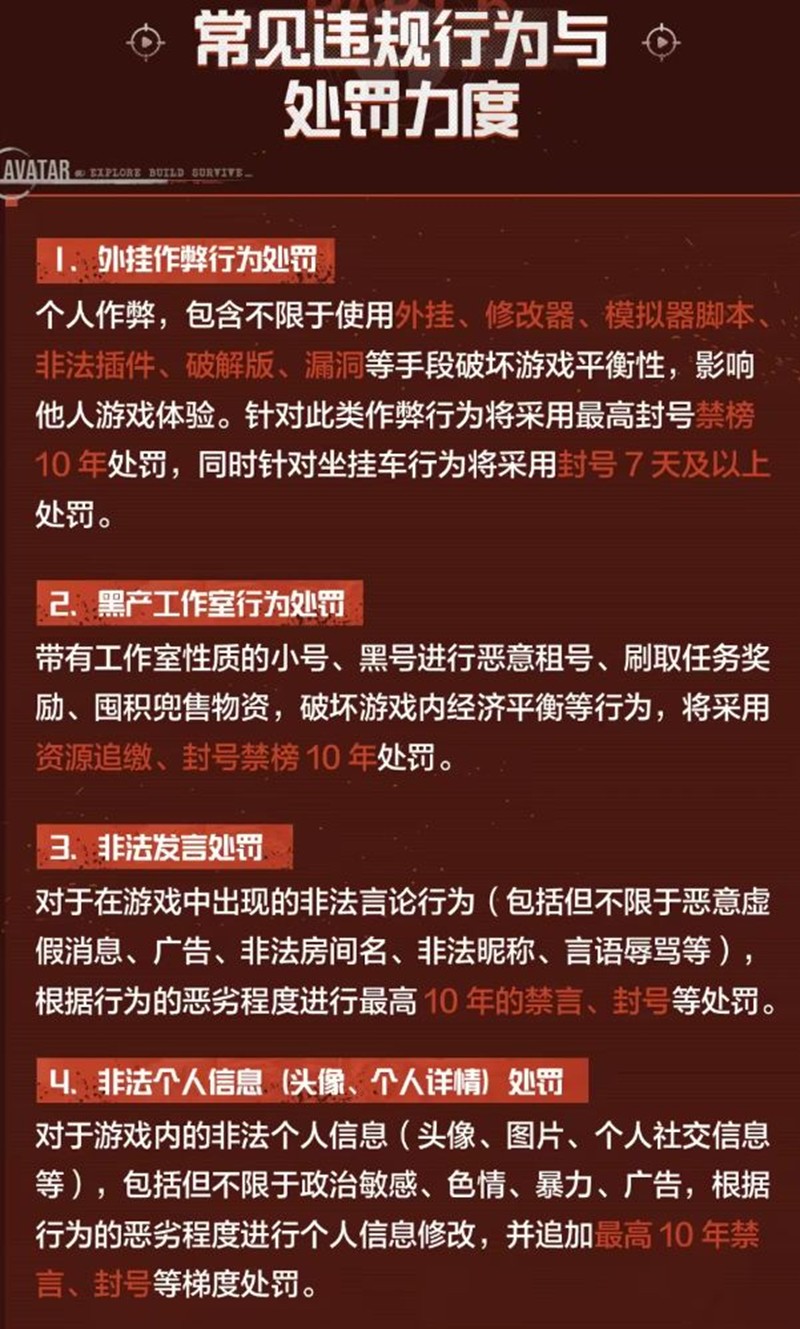 黑产工作室行为处罚:带有工作室性质的小号、黑号进行恶意租号、刷取任务奖励、囤积兜售物资,破坏游戏内经济平衡等行为,将采用资源追缴、封号禁榜处罚。