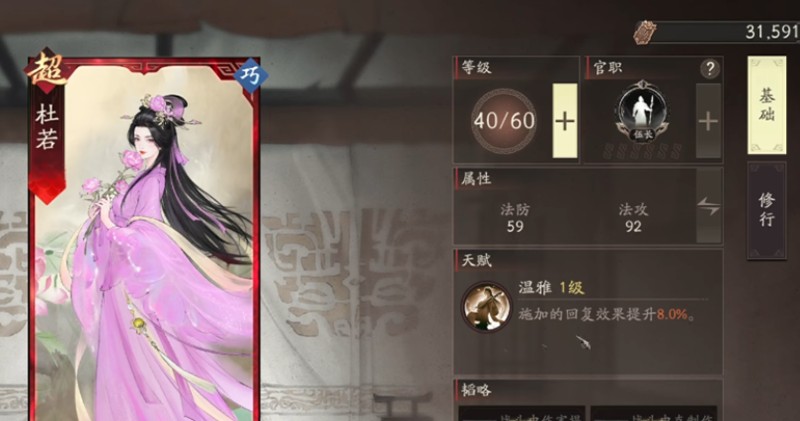 杜若的天赋技能名为温雅,效果是使受到其治疗的角色额外提升8%的恢复能力。这一增益效果在持续战斗中尤为明显,尤其是在推图、副本等需要长时间作战的pve场景中,能够有效缓解治疗压力。该天赋不依赖额外触发条件,只要杜若在场并释放治疗技能,就能稳定生效,因此在搭配其他依赖治疗的武将或阵容时,她的价值会进一步放大。