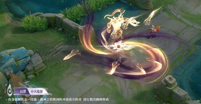 攻击时召唤多把小剑,形成剑阵效果,体现神性操控的秩序感与距离感。