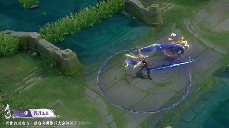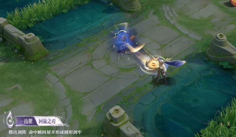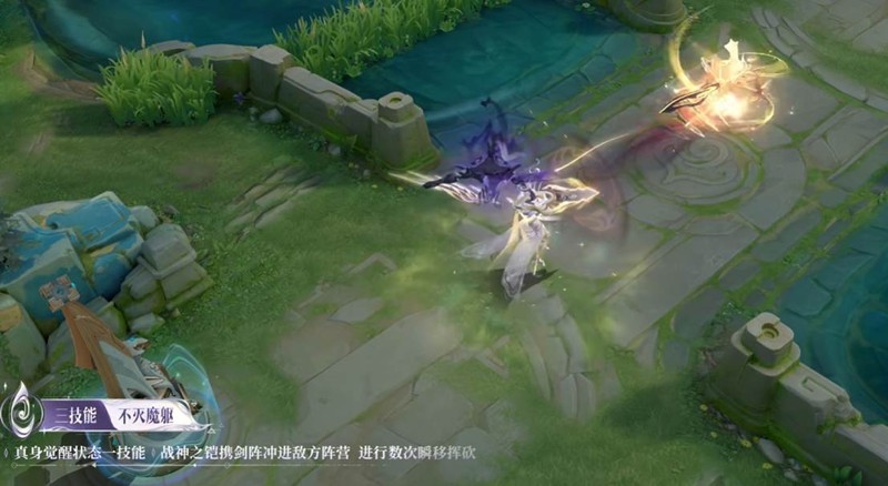 未觉醒状态:掷出由多把小剑组成的剑阵,命中瞬间展开形成圆形剑牢。真身觉醒状态:战神之铠携剑阵冲出,在敌方阵营中进行数次瞬移挥砍。