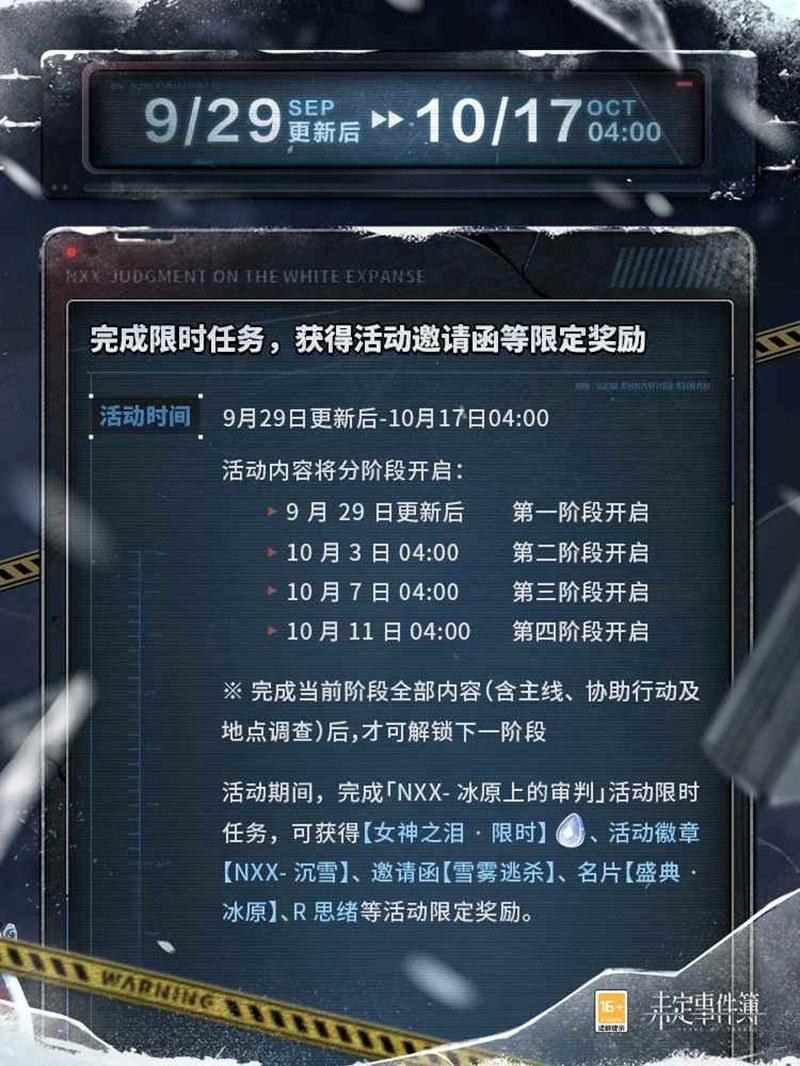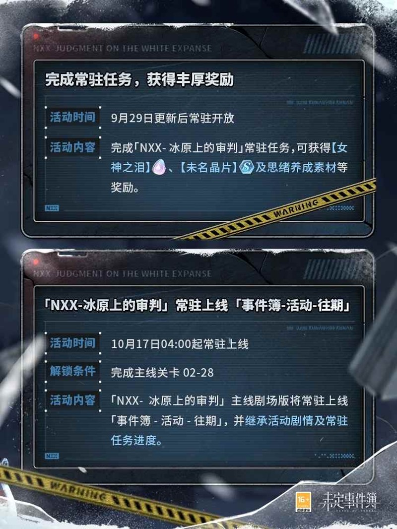 -2025年10月17日04:00起,「NXX-冰原上的审判」主线剧场版将常驻上线「事件簿-活动-往期」,并继承活动剧情及常驻任务进度