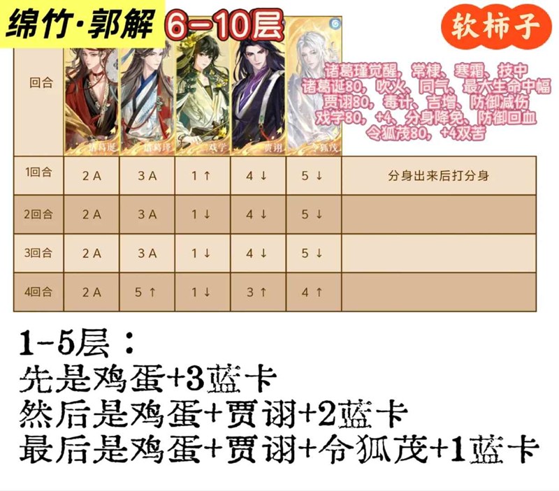 绵竹·郭解:全程用鸡蛋,因为我是用角鲁打关,所以鸡蛋的愉悦值比较富裕。前面就鸡蛋+蓝卡,剩下的看上图。要注意贾诩、戏学和诸葛诞的命盘和往常有些区别哈!这几个盘都是保命的。