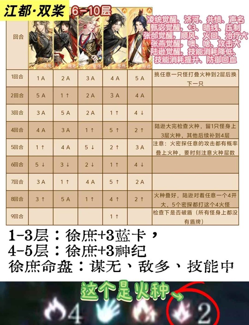 江都·双桨:这个是最要动脑的一关,要注意把5个怪火种叠到44443后,陆逊对着其中一个4开大,然后大家再都打这个4,就能让其在1回合内受到15次火伤从而破除风盾(风盾不破就会一直复活)。