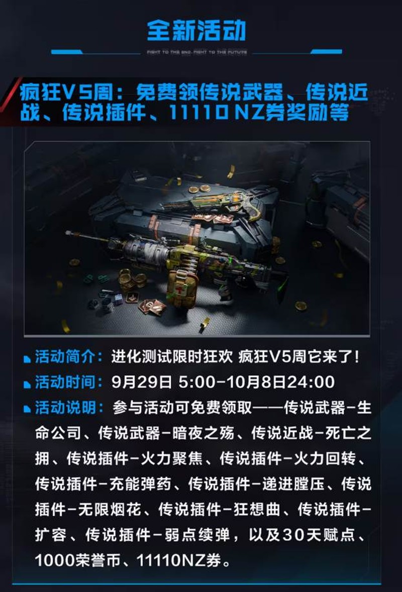 活动内容:玩家参与活动可免费领取传说武器、传说近战、传说插件、11110 NZ券奖励等。包括传说武器-生命公司、传说武器-暗夜之殇、传说近战-死亡之拥、传说插件-火力聚焦、传说插件-火力回转、传说插件-充能弹药、传说插件-递进膛压、传说插件-无限烟花、传说插件-狂想曲、传说插件-扩容、传说插件-弱点续弹,以及30天赋点、1000荣誉币、11110NZ券。