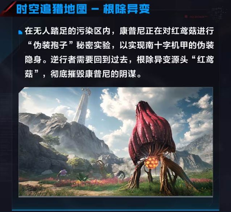 时空追猎地图-根除异变:在无人踏足的污染区内,康普尼正在对红鸢菇进行“伪装孢子”秘密实验,逆行者需要回到过去,根除异变源头“红鸢菇”,彻底摧毁康普尼的阴谋。