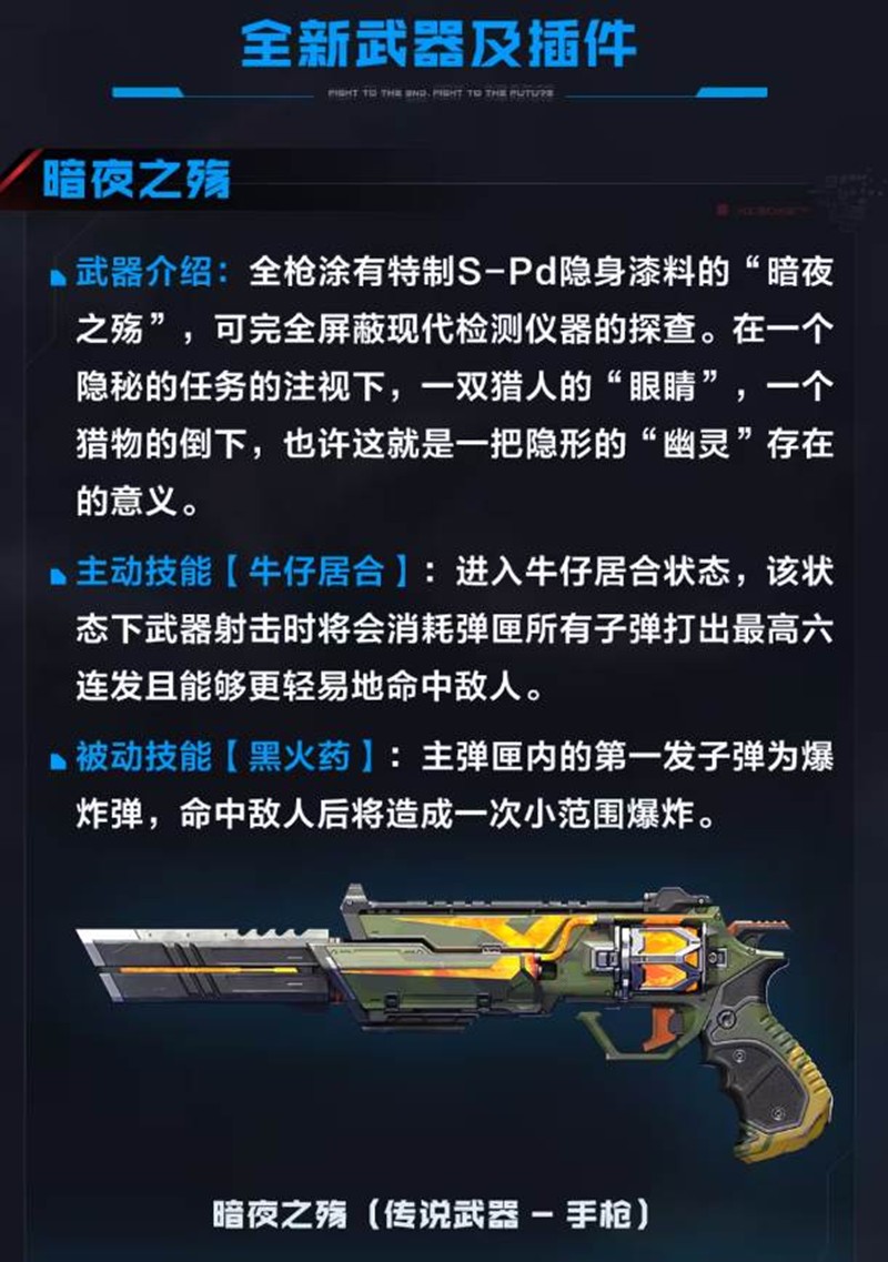 全枪涂有特制S-Pd隐身涂料的“暗夜之殇”,可完全屏蔽现代检测仪器的探查。主动技能【牛仔居合】和被动技能【黑火药】。