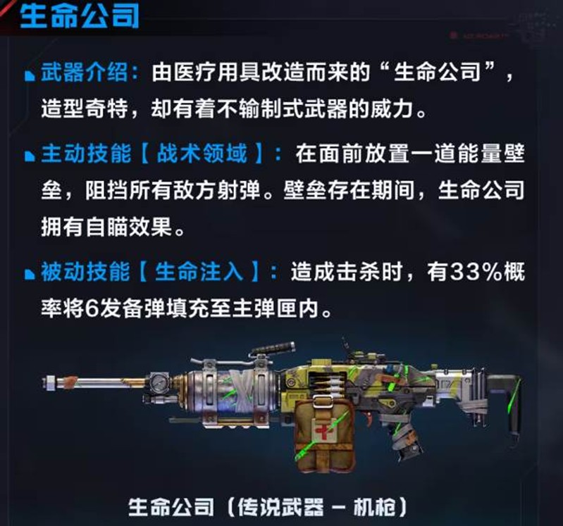 由医疗用具改造而来的“生命公司”,拥有主动技能【战术领域】和被动技能【生命注入】。