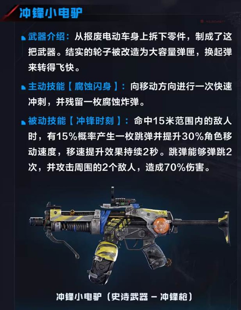 从报废电动车身上拆下零件,制成了这把武器。主动技能【腐蚀闪身】和被动技能【冲锋时刻】。
