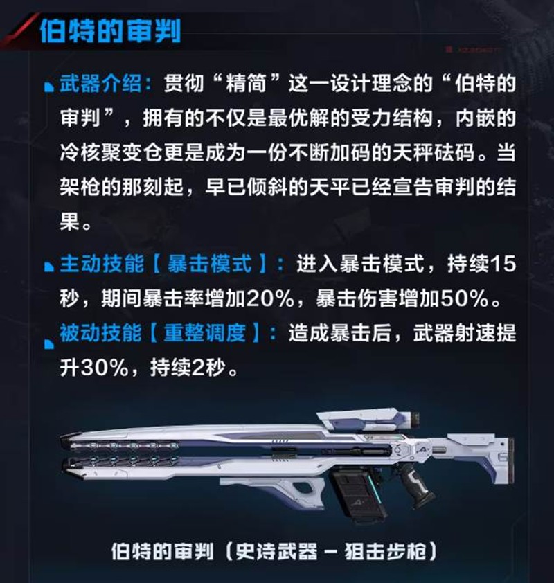贯彻“精简”这一设计理念的“伯特的审判”,拥有主动技能【暴击模式】和被动技能【重整调度】。