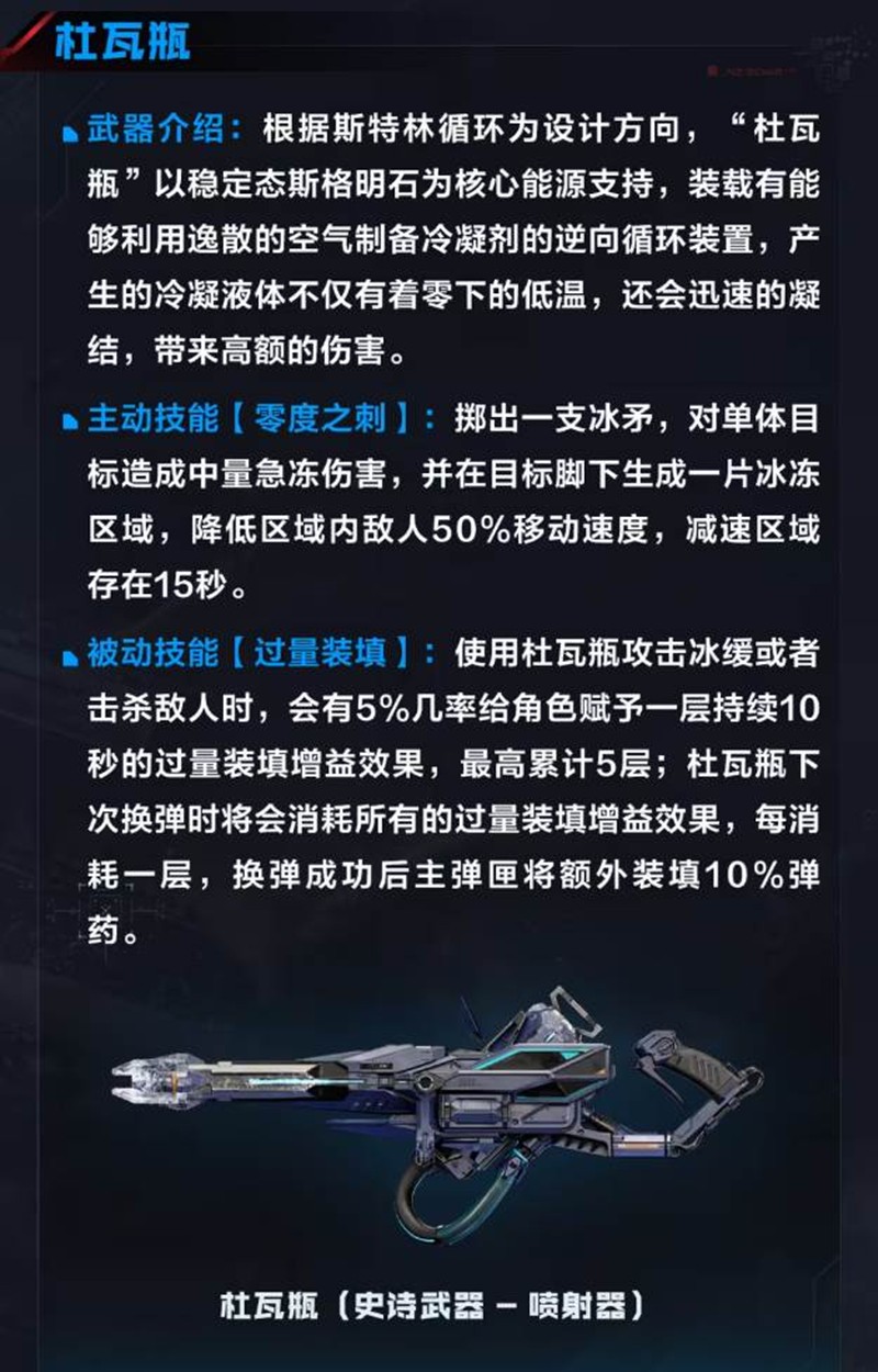 根据斯特林循环为设计方向,“杜瓦瓶”以稳定态斯格明石为核心能源支持。主动技能【零度之刺】和被动技能【过量装填】。