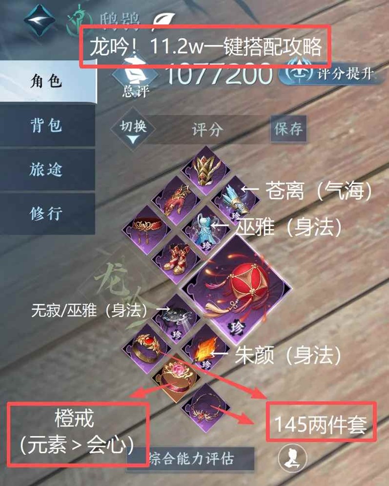 下身:朱颜(身法)+无寂/巫雅(身法)+145两件套+橙戒(元素>会心)