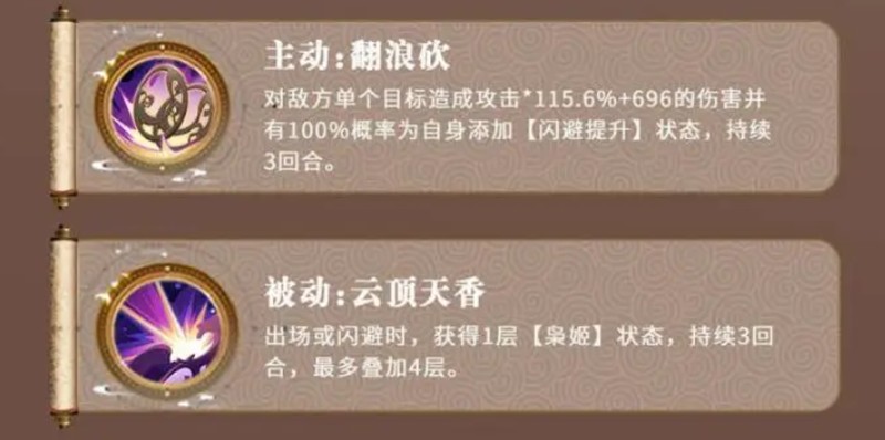 孙尚香的主动技能“翻浪砍”是对单体目标的强力打击,造成攻击115.6%加上固定696点伤害,并百分百附加“闪避提升”状态,持续三个回合。该技能不仅能稳定提升自身生存能力,还能加速被动“枭姬”状态的叠加进程。在战斗初期释放此技能,有助于快速进入状态,为后续输出或濒死重生做好准备。虽然伤害集中于单体,但在面对敌方核心输出时,可作为精准打击手段使用,兼具输出与功能性。