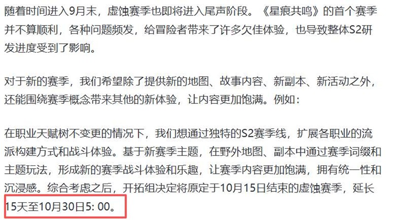 官方表示,星痕共鸣的S1赛季虽然给玩家们带来了许多新鲜的体验,但也存在一些问题,这些问题不仅影响了玩家的游戏体验,也对S2赛季的研发进度造成了影响。为了提供更高质量的游戏内容,开发团队决定延长S1赛季15天,S1赛季将在10月30日开启,这样以便有更多的时间来准备和完善新赛季的内容。