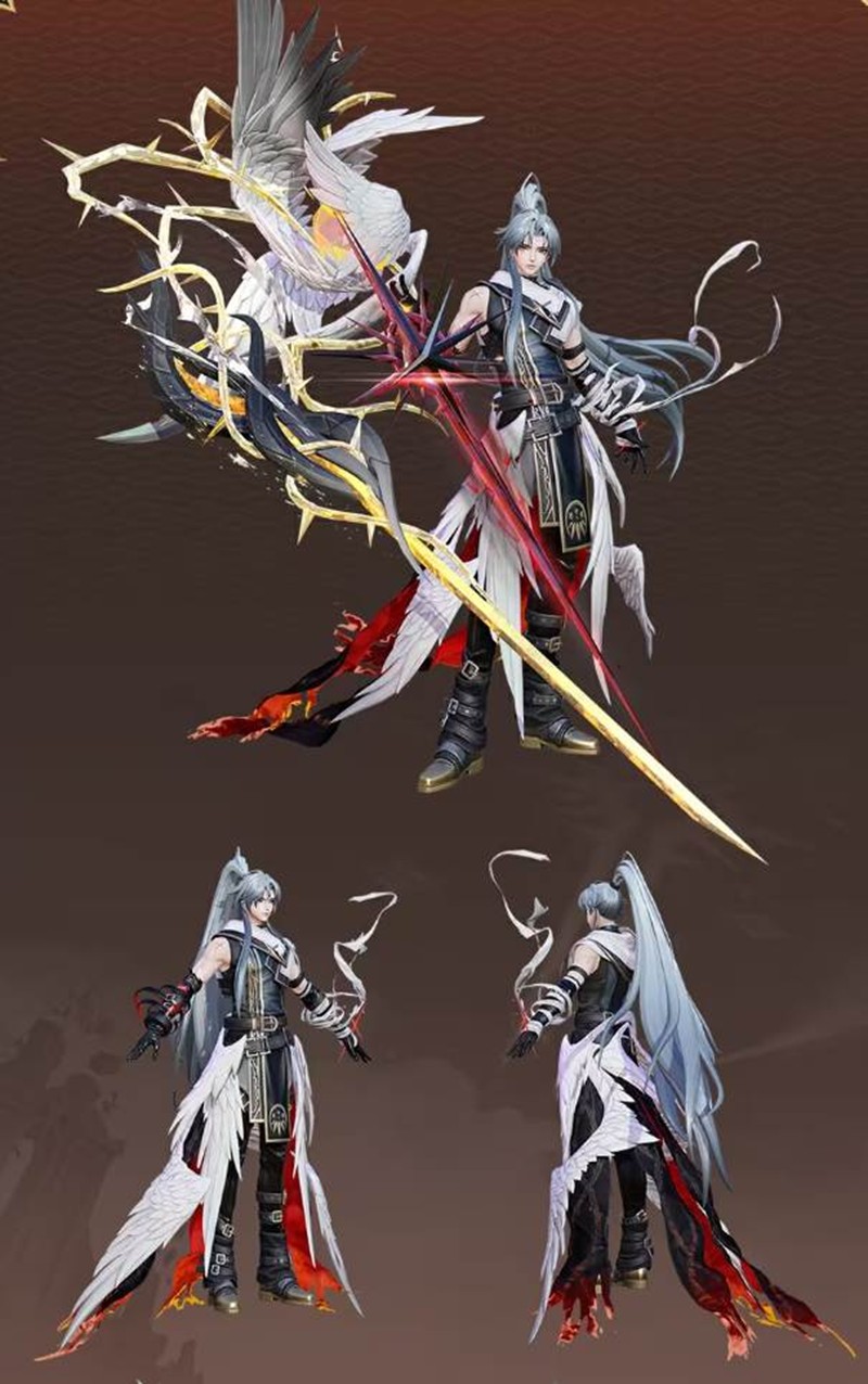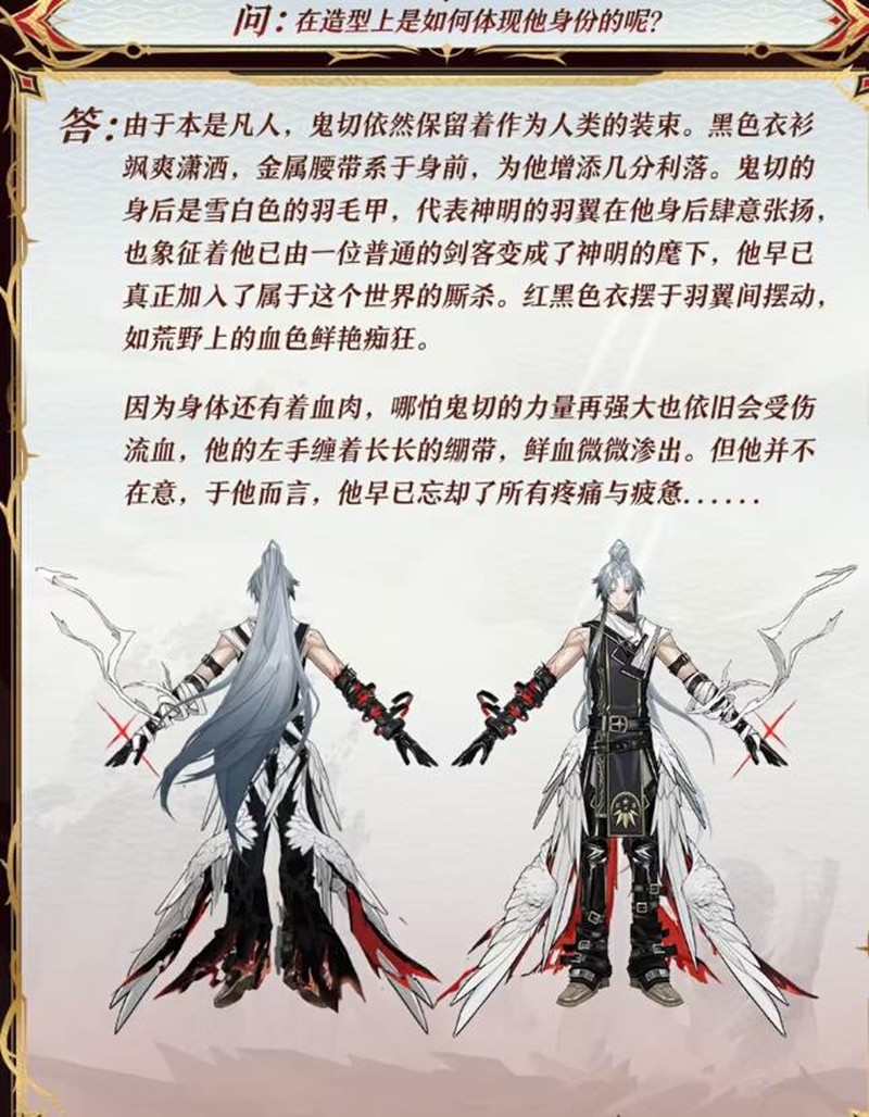 鬼切依然保留着作为人类的装束。黑色衣衫飒爽潇洒,金属腰带系于身前,为他增添几分利落。鬼切的身后是雪白色的羽毛甲,代表神明的羽翼在他身后肆意张扬,也象征着他已由一位普通的剑客变成了神明的麾下,他早已真正加入了属于这个世界的厮杀。红黑色衣摆于羽翼间摆动,如荒野上的血色鲜艳痴狂。
