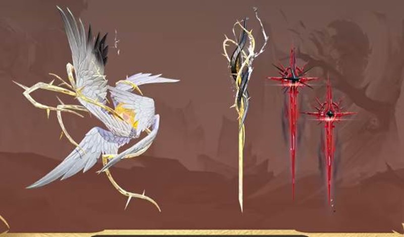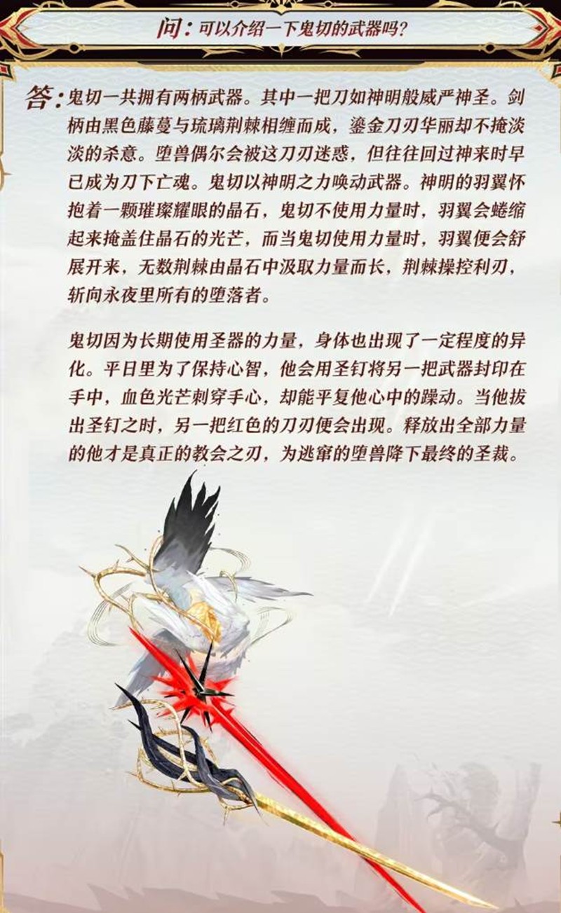 鬼切以神明之力唤动武器。神明的羽翼怀抱着一颗璀璨耀眼的晶石,鬼切不使用力量时,羽翼会蜷缩起来掩盖住晶石的光芒,而当鬼切使用力量时,羽翼便会舒展开来,无数荆棘由晶石中汲取力量而长,荆棘操控利刃,斩向永夜里所有的堕落者。