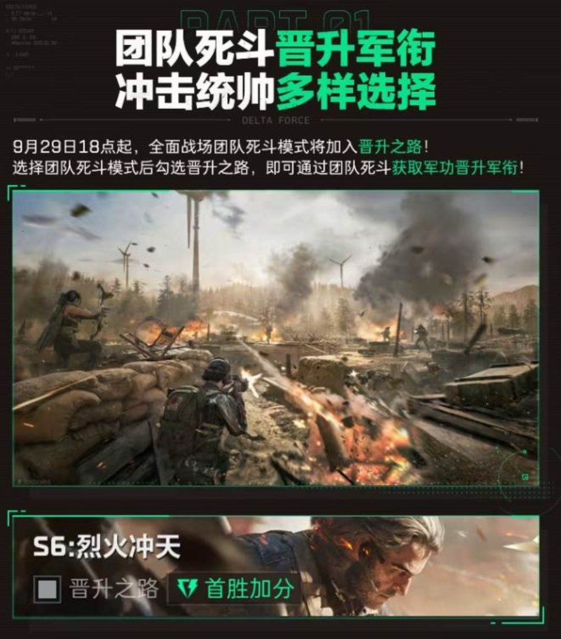 全面战场团队死斗模式将加入晋升之路,玩家可以通过团队死斗获取军功晋升军衔。选择团队死斗模式后勾选晋升之路,即可通过团队死斗获得军功晋升军衔。